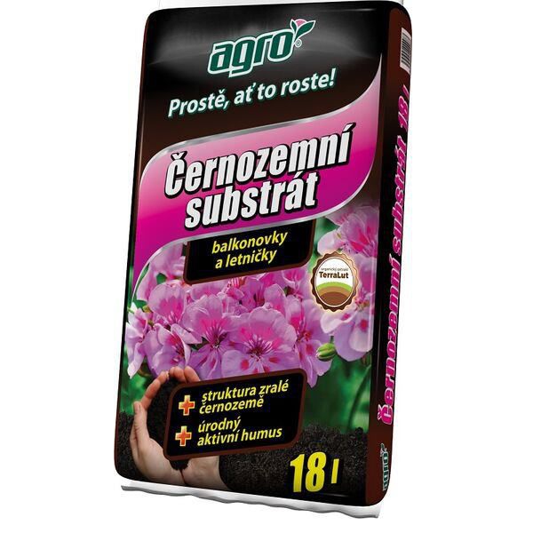 AGRO čiernozemný substrát pre balkónovky a letničky je špeciálny substrát kyprej a vláčnej štruktúry, pripomínajúci tradičnú úrodnú černozem, známu z oblasti Polabia či Podunajska. Jedná sa o zmes kvalitnej čiernej rašeliny, vyzretého kôrového humusu a štartovacích živín. Substrát je vyvinutý pre potreby balkónových rastlín a letničiek pestovaných v nádobách či voľne na záhonoch, ktoré k rastu a k bohatému kvitnutiu potrebujú vysokú dávku živín (pelargónie, petúnie, verbeny, lobelky, begónie, fuchsie, biden a pod.). Substrát sa skladá z rašeliny, kvalitného vyzretého humusu, upraveného pH, štartovacích živín s mikroprvkami na prvé 4 týždne a je obohatený o Terallut. Terallut je špeciálny organický výluh zo sladkovodného rašelinného sedimentu, bohatý na fulvo a huminové kyseliny. Substrát ocenia predovšetkým tí záhradkári, ktorí nedajú dopustiť na bohaté úrodné pôdy a zároveň chcú kvalitný základ na pestovanie bez nežiaducich burín a škodcov. Obsah balenia je 18 l.