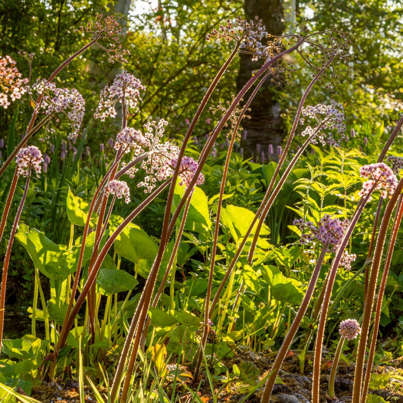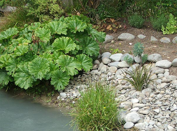 Darmera peltata (indiánska rebarbora, dáždniková rastlina) je vlhkomilná trvalka pôvodom z Oregonu a Californie. Dosahuje výšku a šírku maximálne do 80-100 cm. V porovnaní s gunnerou je to veľkou výhodou, pretože môže byť súčasťou záhrad menších rozmerov. Ako prvé sa na darmere rozvíjajú bledoružové kvety (tvarom ako kvety bergénií), ktoré vyrastajú začiatkom leta na dlhých úzkych stopkách. Následne sa začnú tvoriť malebné, veľké, okrúhle listy, ktoré vytrvajú do prvých mrazov.