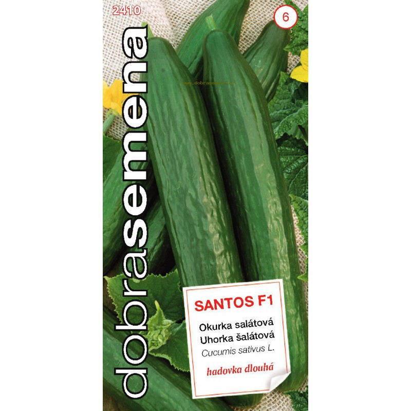 SANTOS F1 - dlhá partenokarpická uhorka hadovka na pestovanie v skleníkoch a fóliových krytoch. Výnosný hybrid pre jarné aj jesenné pestovanie so 100% samičích kvetov. Plod je 30 – 35 cm dlhý, hladký, s krátkym krčkom, geneticky nehorký. Rastlina je rezistentná na kladospórium a tolerantná na vírusovú mozaiku uhorky.