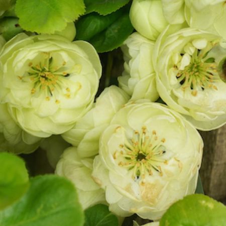 Kinshiden je unikátna odroda dulovca s veľkými, poloplnými kvetmi svetlo zelenožltej farby. Otvárajú sa skoro na jar s príchodom teplejšieho počasia, väčšinou od polovice apríla, ale ak je teplý koniec zimy, môžete už v marci vidieť otvorené puky. Kvitnú pomerne dlho, ešte v máji bývajú kríky plne rozkvitnuté. Po kvete sa tvoria roztomilo neforemné ale veľmi aromatické, zelenožlté plody, skôr na staršom dreve vo vnútri kríka. Dozrievajú v októbri.