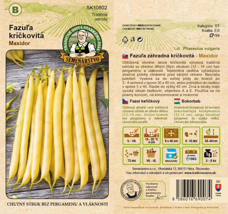 Obľúbená stredne skorá kríčkovitá výnosná tradičná odroda so stredne dlhým žltým strukom (12 - 14 cm) bez pergamenu a vláknosti. Teplomilná rastlina vyžadujúca slnečné polohy chránené pred silnými vetrami. Neznáša polotieň. Vysieva sa do voľnej pôdy do hniezd po 3 - 4 semená v spone 30 x 40 cm, alebo jednotlivo do riadkov v spone 5 x 40. Rastie do výšky 40 cm. Zrná a struky majú vysoký obsah bielkovín, vitamínov A a E. Používa sa na priamy konzum, na konzervovanie a mrazenie.