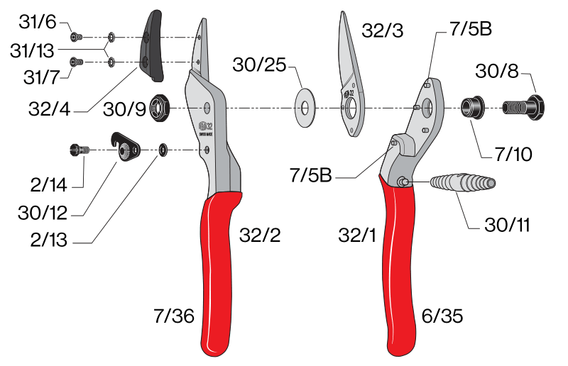 Felco 32 - pre väčšiu ruku, strih do priemeru 25 mm, sú určené pre použitie predovšetkým v sadoch, parkoch a záhradníctvach. Nožnice disponujú protiostrím Amboss (nákova). Strihacia hlavica je ideálna pre strih drevín, ktoré pri strihu vypúšťajú veľké množstvo miazgy.
