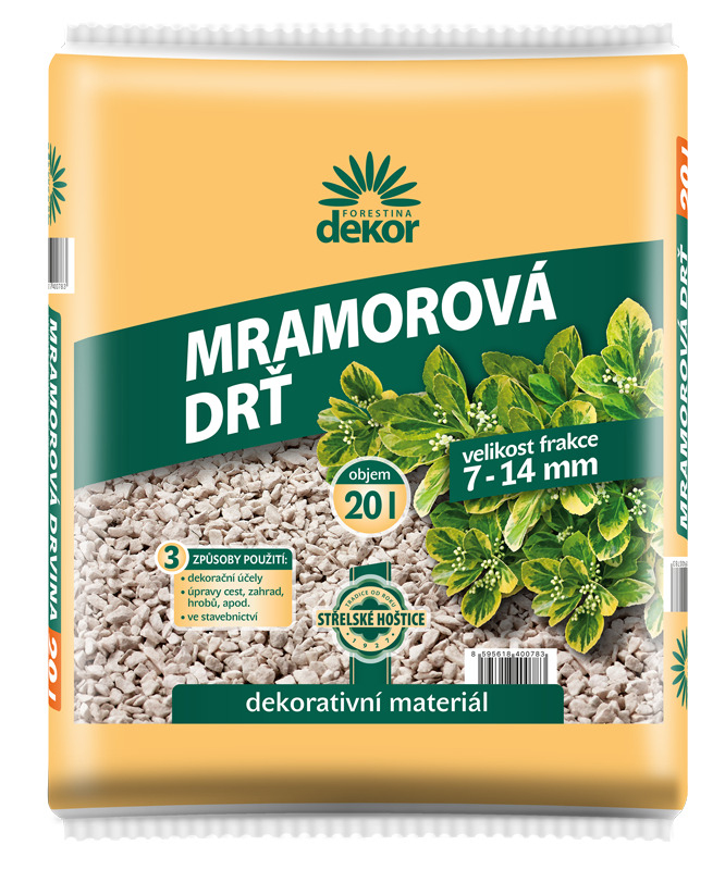 Drť mramorová Forestina DEKOR 7-14mm - 20l.Mramorová drvina je vhodná na dekoračné účely v interiéroch i exteriéroch. Možno ju použiť na úpravu ciest, chodníkov aj pietnych miest či k vymedzeniu plôch v okrasnej záhrade. Slúži tiež ako dekorácia do terasových nádob a kvetináčov. Frakcia: 7 - 14 mm. Zloženie: Drvené mramorové kamienky bielej farby