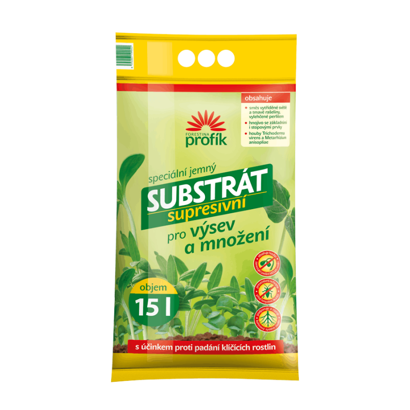 Supresívny výsevný substrát je určený špeciálne pre výsevy a množenie rastlín. Je vhodný ako na siatie, tak aj k prepichovaniu odrezkov rastlín. Substrát je obohatený o hnojivo so základnými i stopovými živinam v nevyhnutnom rozsahu, čo má priaznivý vplyv na bezproblémové zakoreňovanie odrezkov a klíčenie rastlín. Substrát je obohatený o hubu Trichoderma virens a Metarhizium anisopliae, ktoré zaisťujú čistotu substrátu. Huba Trichoderma virens, ktorá aktívne potláča pôvodcov významných hubových ochorení vrátane fytopatogénnych húb rodu Fusarium, Pythium, Sclerotinia, Rhizoctonia. Tieto fytopatogénne huby spôsobujú padanie a odumieranie klíčiacich a vzchádzajúcich rastlín a preto používanie výsevného substrátu obohateného o antagonistický organizmus, predstavuje významný preventívny prvok v ochrane sadeníc.Zároveň má prítomnosť tejto huby priaznivý účinok na zakoreňovanie a vývoj rastlín, rastliny na prítomnosť tohto oragnizmu reagujú navodením tzv. indukovanej rezistencie t.j. stavu zvýšenej odolnosti voči širokému spektru škodlivých organizmov. Ďalej je obohatený aj o hubu Metarhizium anisopliae, ktorá predstavuje účinnú prevenciu pred hmyzom poškodzujúcim klíčiace a vschádzajúce rastliny. Hlavným cieľom zámernej inokulácie substrátu týmto užitočným organizmom, je ochrana sadeníc rôznych druhov sadeníc a okrasných rastlín pred škodcami napádajúcimi koreňový systém rastlín. Napr. pred larvami kováčikovcov (tzv. drôtovce), lariev chrústa, krtonožiek,.. Okrem druhov škodcov, ktorí sa vyskytujú výhradne v pôde, je významný aj účinok huby na hmyzích škodcov, ktorí sú v pôde len časť svojho vývoja (napr. strapky)Substrát nevystavujte priamemu slnečnému žiareniu (vysokým teplotám) a uchovávajte ho v tme a chlade.Objem náplne 15 litrov.