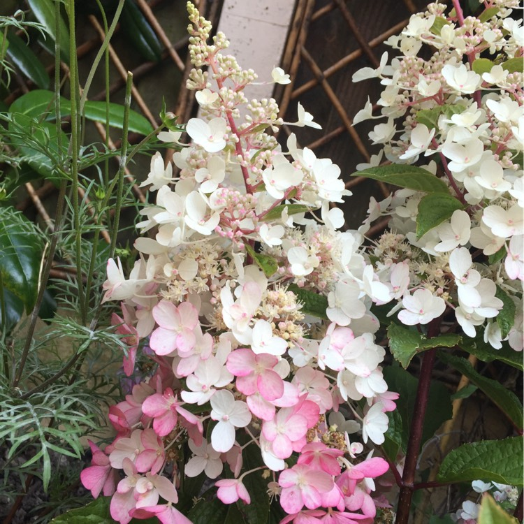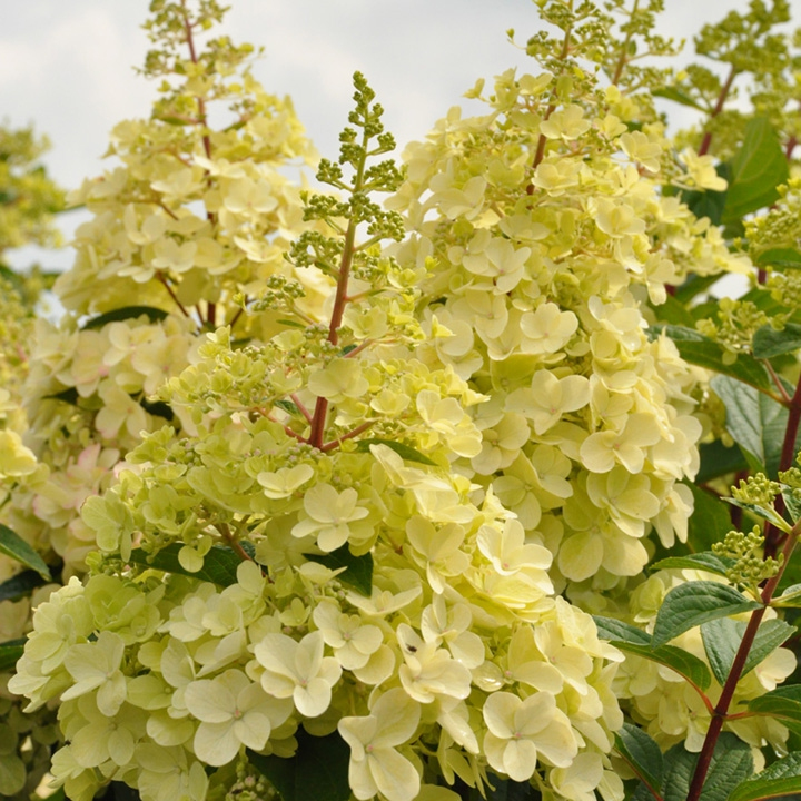 Hortenzia s veľkými súkvetiami krémovo žltej farby, ktorá sa časom mení na sýto ružovú.