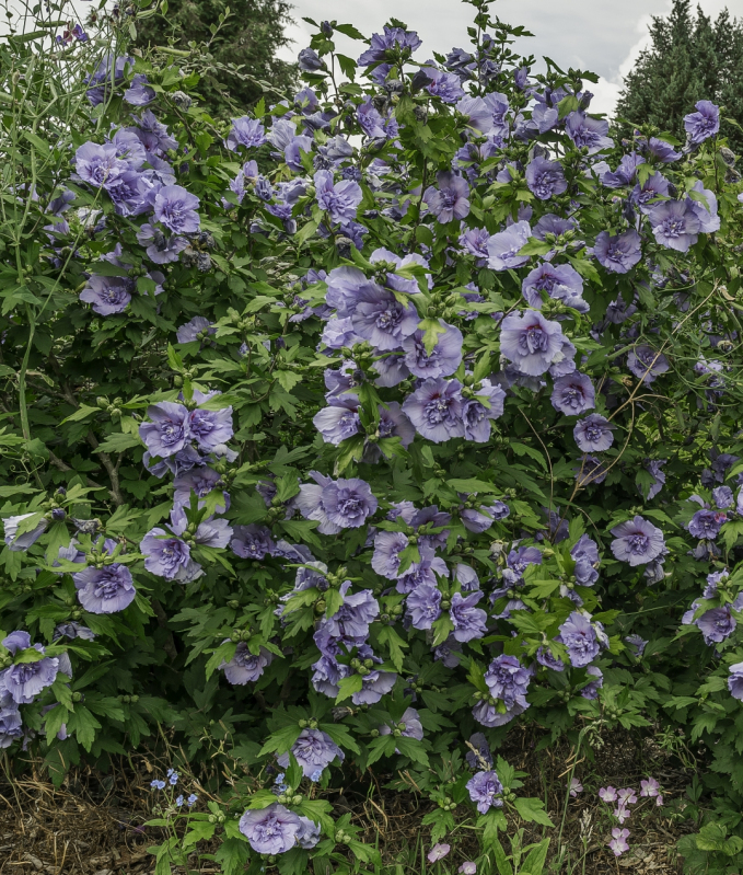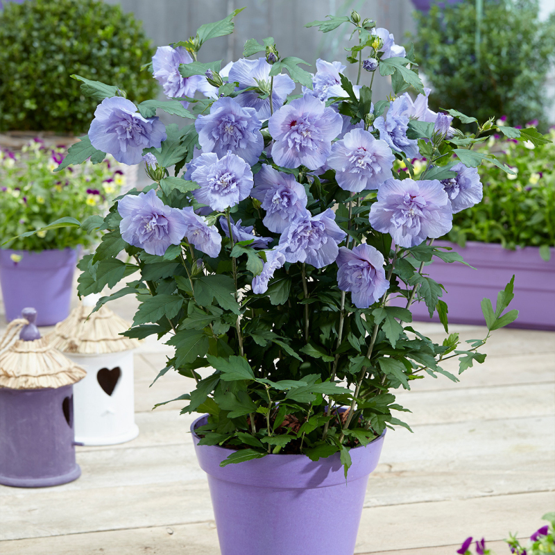 Hibiscus syriacus ’Blue Chiffon’ - ibištek, je novinkou medzi plnokvetými kvitnúcimi krami. Má neskutočne nádhernú levandulovo-fialovú farbu kvetov. Kvety sa objavujú v polovici leta a neprestajne kvitnú až do konca septembra.