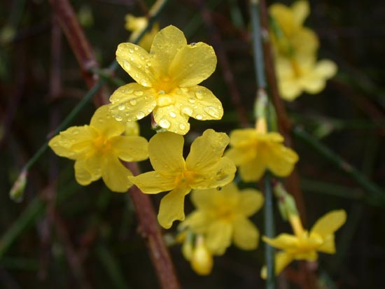Veľmi odolná popínavá rastlina voči poveternostným podmienkam ako je chlad alebo mráz. Neobtáča sa ako iné popínavky, takže je vhodné vysádzať k hustejšiemu porastu poprípade váčším skalám atd. Jasminum nudiflorum, jasmín so žltým kvitnutím na prelome zimy a jari. Zakvitá nearomatickými kvetmi, ktoré zdobia sviežozelené dlhé vetvičky. Zelenú farbu si zachovávajú aj počas zimy, preto je atraktívny aj v tomto období.