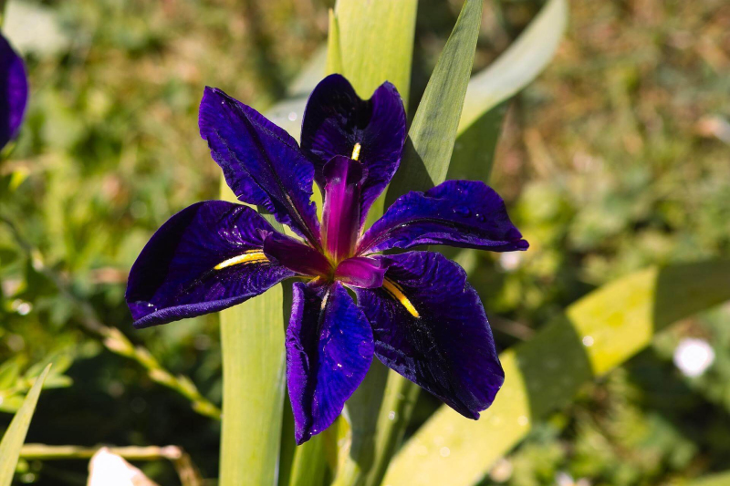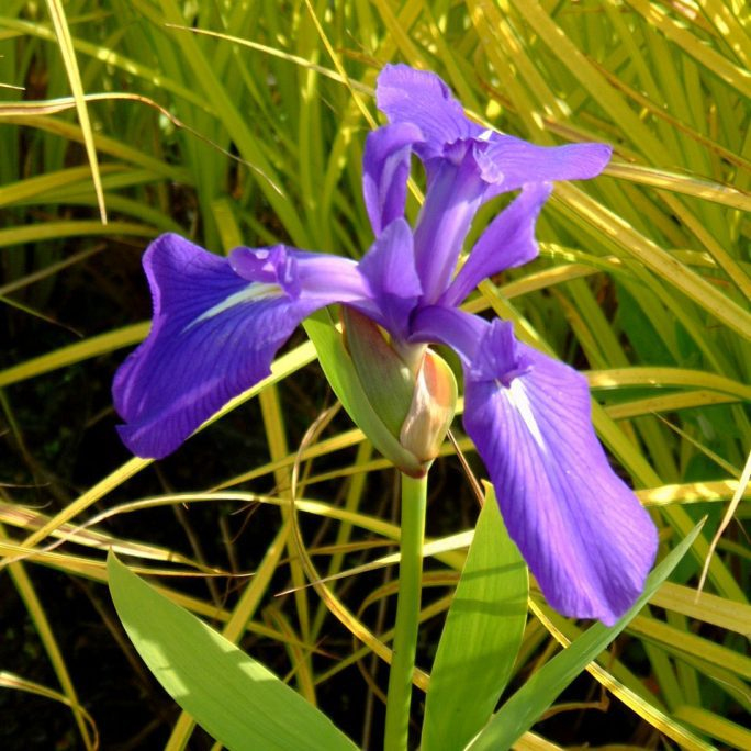 Vodný kosatec kvitnúci na fialovo, rastlina je rovnako vhodná do záhradnej pôdy, ako aj na mokré miesta k jazierku.