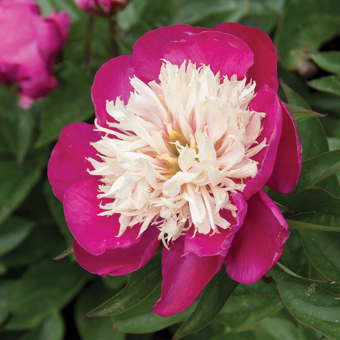 Pivónia White Cap má veľké, ružovo červené kvety, v strede s množstvom krémovo bielych ihlicovitých lupienkov, ktoré neskôr v sezóne môžu byť ružové. Úžasný kontrast červenej a bielej farby žiari v záhrade a láka pohľady návštevníkov.