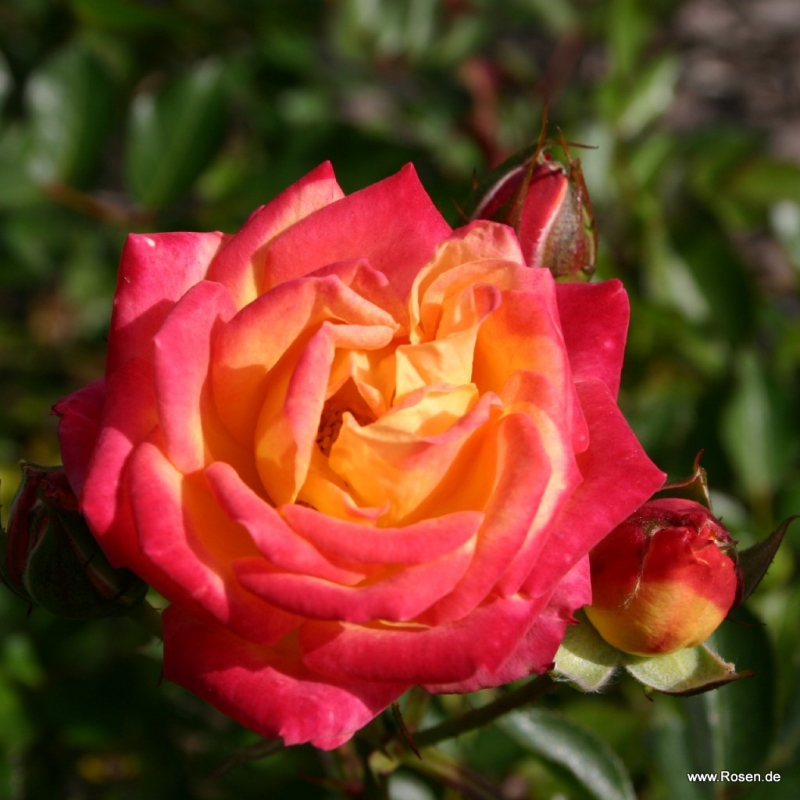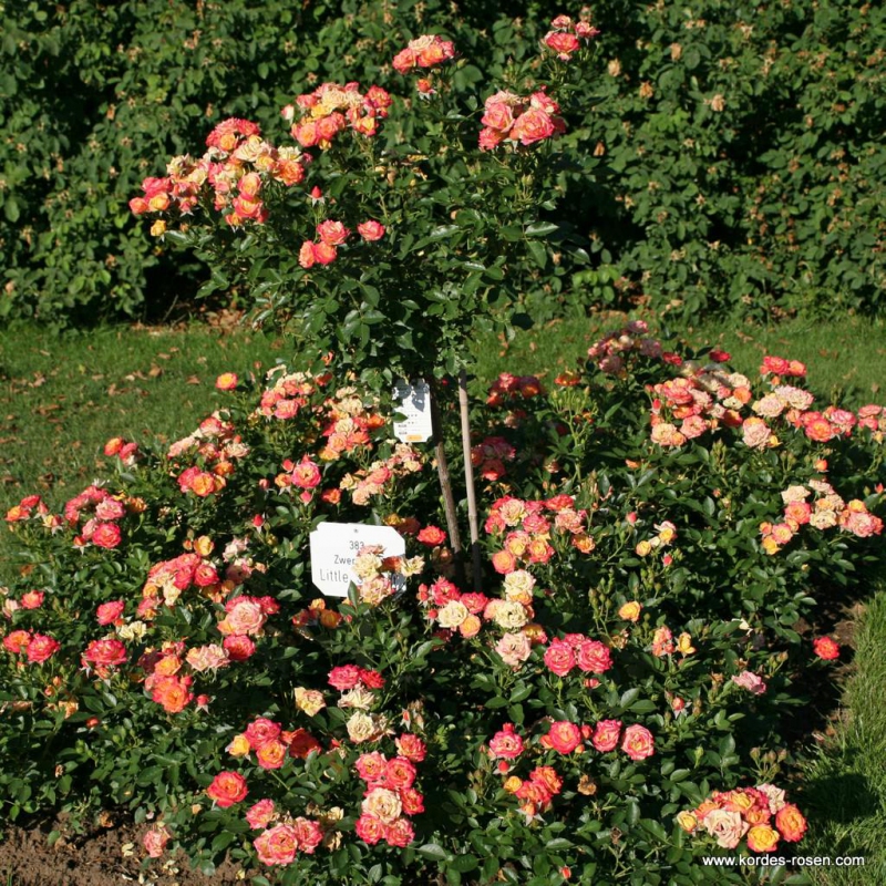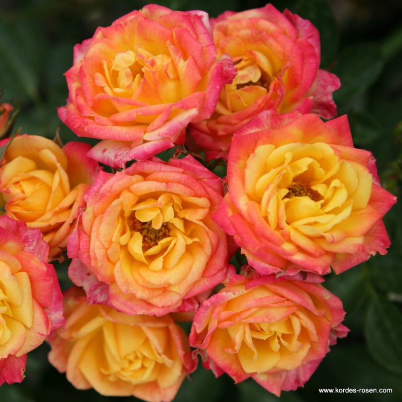 Miniatúrna ružička v atraktívnej kombinácii farieb kvetov so žltým stredom a červenými okrajmi okvetných plátkov, vynikajúca i do nádob.
