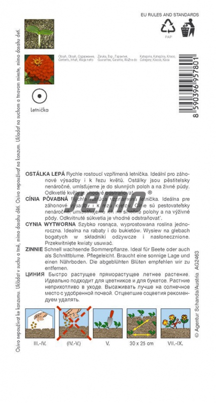 Rýchlo rastúca vzpriamená letnička. Ideálne pre záhonové výsadby aj na rez. Životnosť kvetov vo váze je 8 až 10 dní. Pestovateľsky nenáročná, umiestňujeme ju do slnečných polôh na výživné pôdy. Odkvitnuté kvety odstraňujeme. Selekcia žiarivo červených plných kvetov.