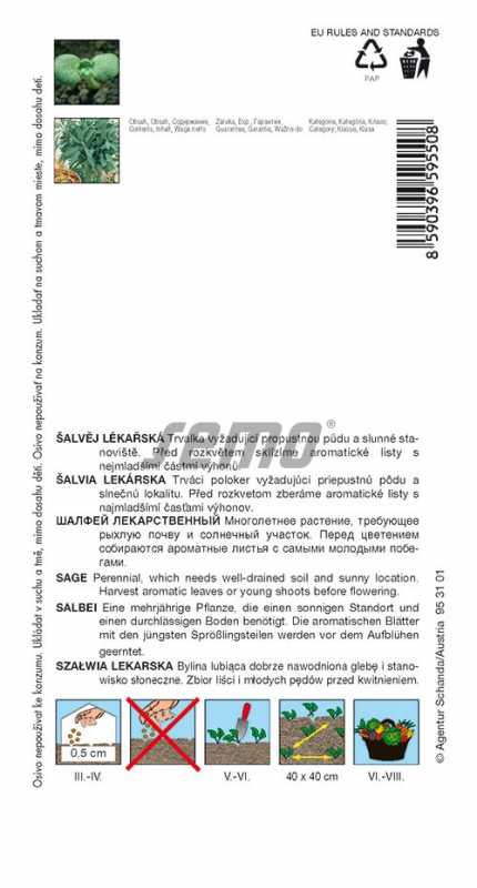 Vytrvalý poloker s metlovito rozvetvenou stonkou a oválnymi sivými listami. Vyžaduje priepustnú pôdu a slnečné stanovište. Zberáme listy s najmladšími časťami výhonov. Používa sa ako korenie, odvar má protizápalové a dezinfekčné účinky, znižuje hladinu cukru v krvi a používa sa ako podporný liek pri cukrovke. Upozornenie: čaj iba zo šalvie nie je vhodné používať dlhodobo!