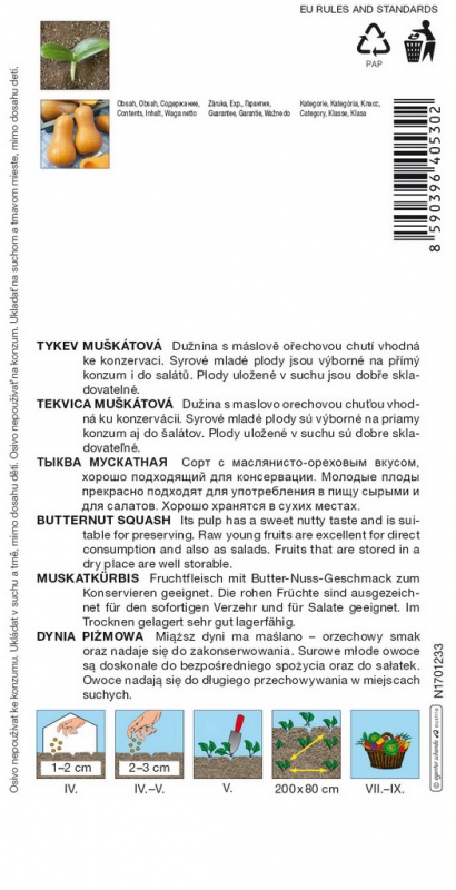 Maslová tekvica s malými hruškovitými plodom svetlo zelenej, neskôr okrovej farby s hmotnosťou 1 – 1,5 kg. Malý semenník je umiestnený iba v hlave plodu. V skorej zrelosti je dužina krémovo biela až svetlo žltá, s maslovo orechovou chuťou, obsahuje malé množstvo semien, v plnej zrelosti je jasne oranžová. Dužina je maslovej konzistencie a príjemnej orieškovej chuti. Ďalšou prednosťou tejto odrody je jej skorosť. Násada na rastline je 3 - 5 plodov. Používa sa na konzervovanie, surové mladé plody sú vhodné na priamy konzum, rôzne kuchynské úpravy, je vynikajúci na polievky a vhodná aj na prípravu šalátov.