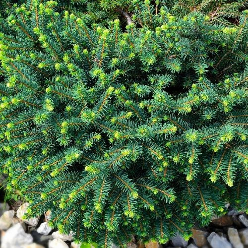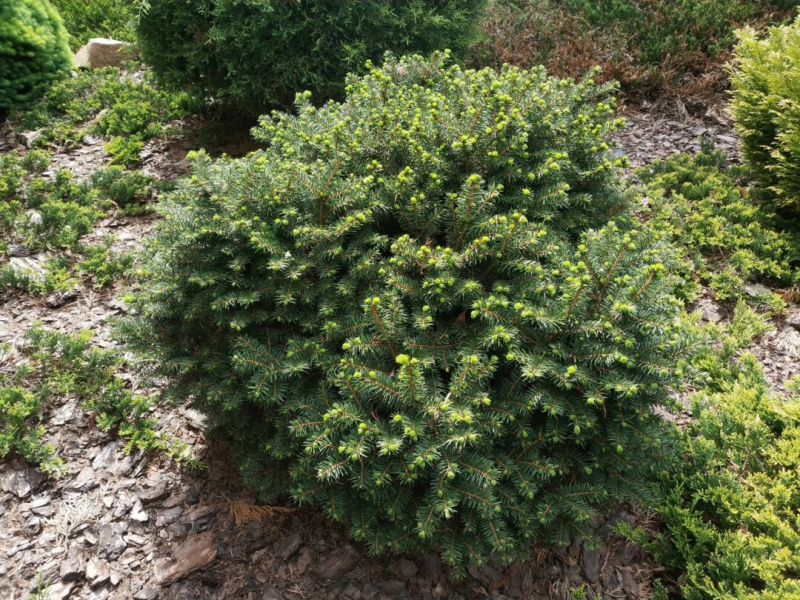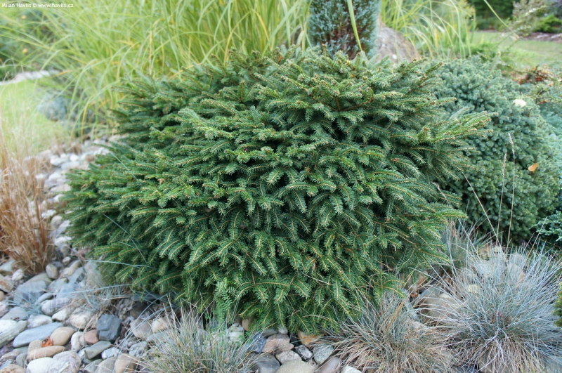 Tento mimoriadne hustý malý trpasličí ihličnan guľovitého až kupolovitého tvaru dorastá do výšky 0,4 až 0,8 metra a šírky 0,6 až 1 meter. Má drobné ihličie sýtozelenej farby. Neznáša podmočené a veľmi ťažké pôdy. Tento miniatúrny smrek je ozdobou každej skalky, črepníka a záhonu, najmä pre jeho drobné mäkké ihličie.