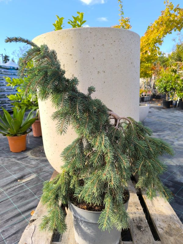 Svetlé, strieborno-modré ihličie nesené na kaskádových konároch dávajú tomuto plačúcemu stromu ladný vzhľad a krásnu farbu. Mladé rastliny možno nechať volne, aby vytvorili divú, takmer zem pokrývajúcu rastlinu.