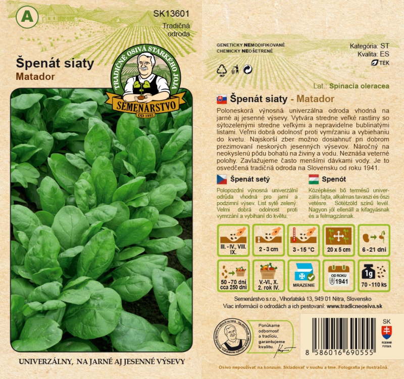 Poloneskorá výnosná univerzálna odroda vhodná na jarné aj jesenné výsevy. Vytvára stredne veľké rastliny so sýtozelenými stredne veľkými a nepravidelne bublinatými listami. Veľmi dobrá odolnosť proti vymŕzaniu a vybiehaniu do kvetu. Najskorší zber možno dosiahnuť pri dobrom prezimovaní neskorých jesenných výsevov. Náročný na neokyslenú pôdu bohatú na živiny a vodu. Neznáša veterné polohy. Zavlažujeme často menšími dávkami vody. Je to osvedčená tradičná odroda pestovaná na Slovensku od roku 1941.
