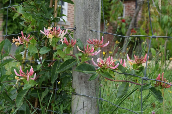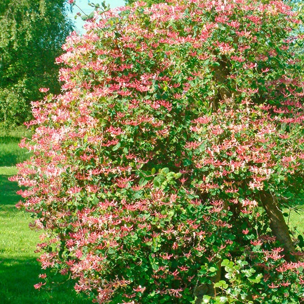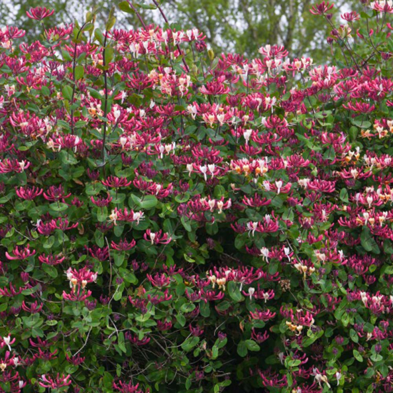 Popínavý, opadavý, lianovitý ker, dorastá do výšky 2-5 m. Pomerne husté a pravidelné vetvenie. Listy takmer okrúhle, 4-5 cm veľké, temne až šedo zelené. Kvety trubkovité, vo vnútri smotanovo bielej, zvrchu purpurovej až vínovej. Kvety výrazne sladko voňajú, najviac na večer. Plody karmínovo červené, 1-1,4 cm veľké. Slúžia ako potrava vtákom.